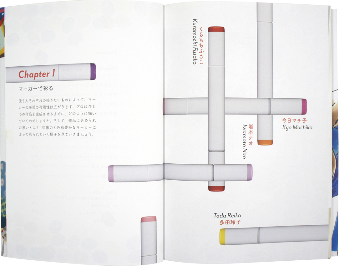 マーカーは楽しい 現役で活躍している作家の方々に参加していただき、マーカーのテクニックを紹介。読み物としても楽しんでもらえるよう、柔らかい印象を与える書体選択や、全体の密度が高くならないレイアウトを心がけました。 — Publisher:玄光社 Edit:Playce Book Design:小川順子